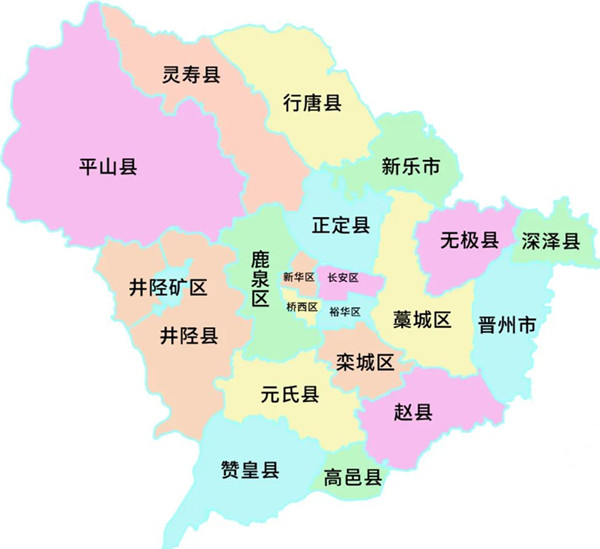 石家莊 長安區(qū)、橋西區(qū)、新華區(qū)、井陘礦區(qū)、裕華區(qū)、藁城區(qū)、鹿泉區(qū)、欒城區(qū)、辛集市、晉州市、新樂市、井陘縣、正定縣、行唐縣、靈壽縣、高邑縣、深澤縣、贊皇縣、無極縣、平山縣、元氏縣、趙縣 |
